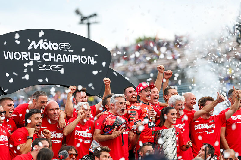 Marc Márquez conquistó en Motegi su noveno campeonato del mundo —séptimo en MotoGP— tras un año de dominio incontestable a lomos de la Ducati Desmosedici GP25. El ‘Tro de Cervera’ volvió a lo más alto después de años de lesiones y dudas, ganándose la admiración de rivales, leyendas y dirigentes del Mundial.